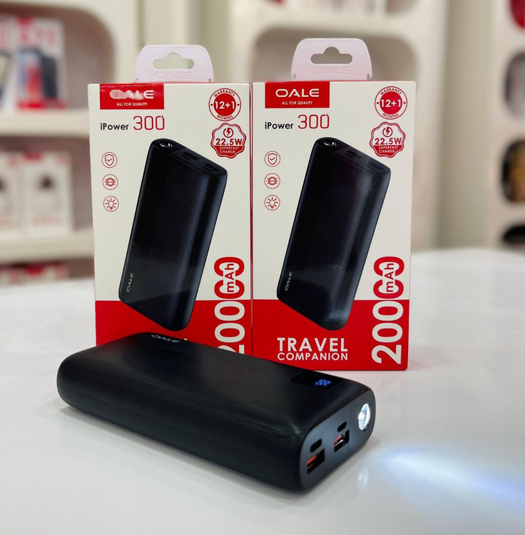 پاوربانک برند OALE مدل ipower 300 با ظرفیت 20000 میلی آمپر ساعت که جزو گزینه های قدرتمند و سریع در شارژ دستگاه ها محسوب می شود. با توان خروجی 22.5 وات و پشتیبانی از شارژ سریع با استاندارد های PD 3.0 وQC 3.0 برای شارژ سریع تر گوشی ها و سایر دستگاه ها و ظرفیت 20000 میلی امپر ساعت مناسب چند بار شارژ کردن کامل گوشی های هوشمند تبلت ها و سایر دستگاه ها. مجهز به چراغ LED سه حالته برای مواقع اضطراری. دارای نمایشگر LED برای نمایش دقیق درصد باتری. این پاور بانک با ظرفیت بالا و طراحی شیک و مدرن گزینه ای عالی برای استفاده روزمره و سفر میباشد.