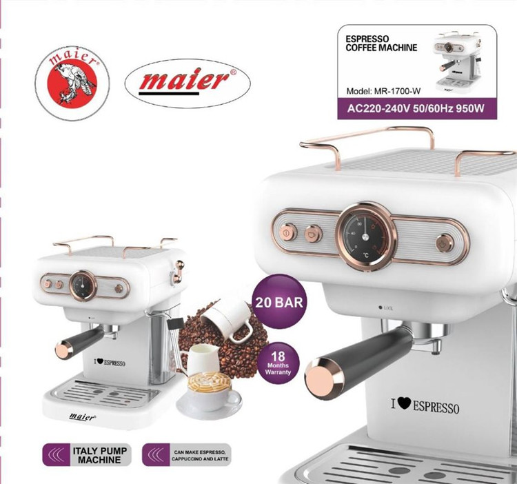 دستگاه اسپرسوساز مایر مدل Maier MR-1700 دستگاهی بسیار زیبا و خوش سیما میباشد که انتخابی مناسب برای مصارف خانگی میباشد. این دستگاه با فشار بخار 20 بار، عصاره گیری بسیار باکیفیتی را انجام میدهد و قهوهای دلچسب را تحویل میدهد. دستگاه MR-1700 با سیستم کف شیر خود، فوم شیر بسیار مخملیای را برای نوشیدنی هایتان درست کند و میتوانید با استفاده از آن از طعم بینظیر لاته و کاپوچینو لذت ببرید. این محصول همچنین دارای سیستم گرم نگهدار و خاموش شدن خودکار نیز میباشد و در 2 رنگ سفید و مشکی عرضه میشود.